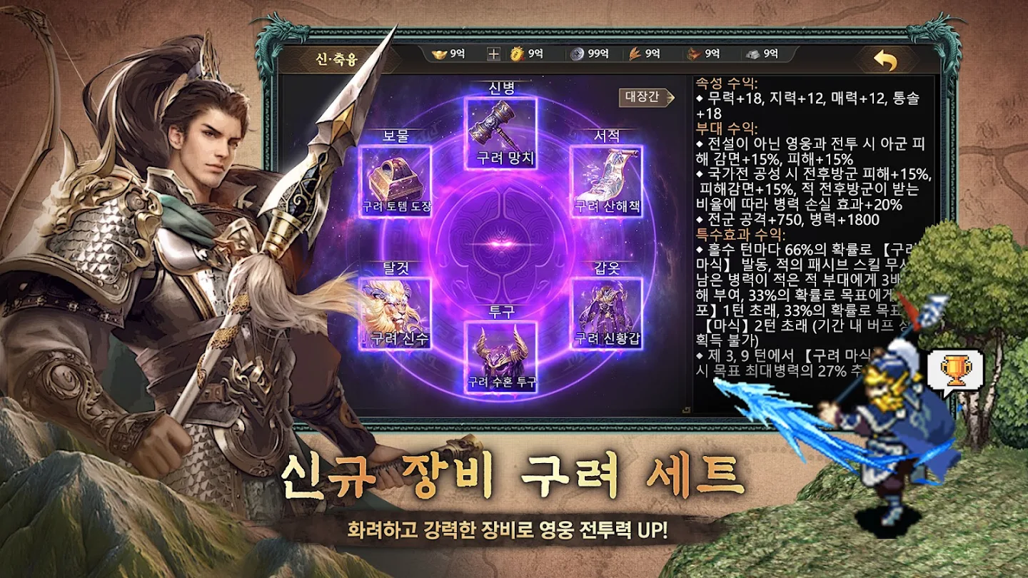 - 전략적인 전투 시스템: 병종 상성, 지형 효과, 장수 스킬 등을 고려하여 전략적인 전투를 펼칠 수 있습니다. 실시간으로 부대를 배치하고 명령을 내려 승리를 쟁취하세요.